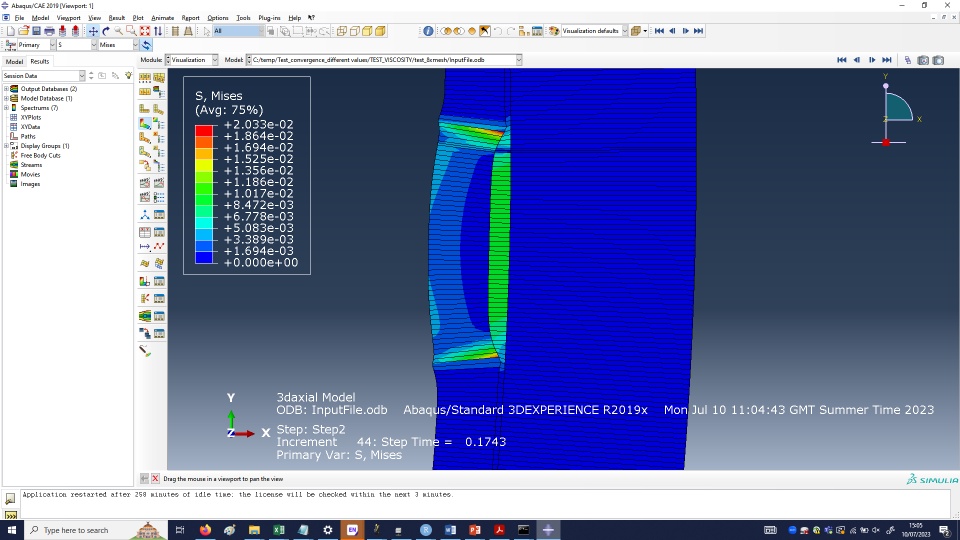 I made a 2D model where I injected fluid into a porous cohesive layer and as shown in the picture it expands and generate a blister of fluid as expected (simulation converge). However when I increased the injection rate from 3mm^3/s to 5mm^3/s I obtained a distrotion of the solid elements (CPE4H) which cause a stop of the simulation. Do you have any suggestion on what can cause it? I expect it can be related to the mesh density in the solid elements. Second image is when the error is generated, and you can see the distortion of the elements.