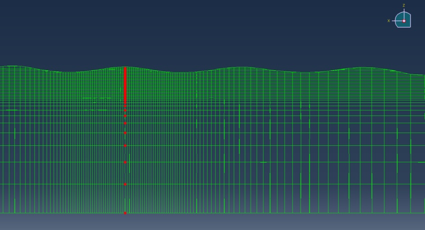 I have an Eulerian domain used to generate regular ocean waves. I want to measure the wave amplitude and period at a certain point along the horizontal axis (X axis). To do so, I need to plot the displacement of the free surface along Z direction in a certain plane (normal to X axis shown in red color) vs time. Is there any way to do so given that the nodes are fixed and only the material moves?