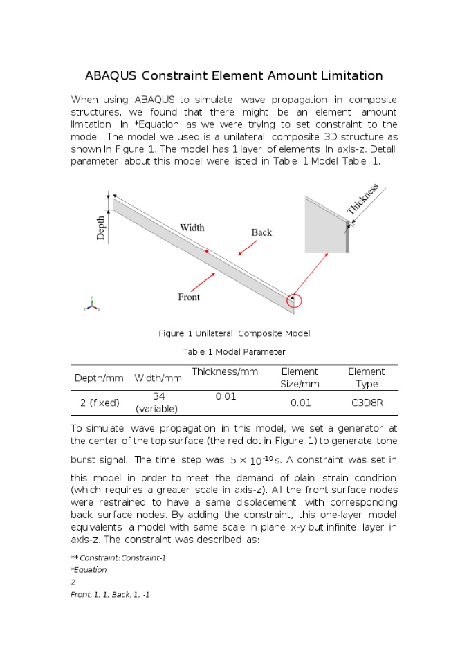 Following the procedures given in a SIMULIA Community Conference paper (2014-Weidong Wu-Applying Periodic Boundary Conditions in Finite Element Analysis), we were trying to use "*Equation" command to simulate the wave propagation in a large composite block, by modelling a finite Representative Volume Element (RVE). As shown in the figure, 3D brick elements (C3D8R) of finite thickness was modelled, with PBC applied to the front and back surface node set, in order to mimic a plain-strain case (along z axis, thickness direction). This approach works well with a total amount of element less than 0.7 million, whereas it fails with internal error as the element amount goes above 0.7million!