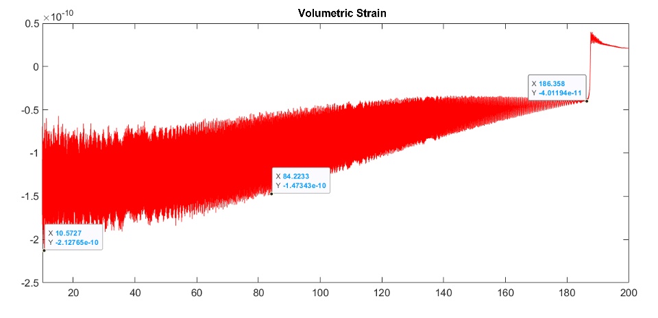 Then I plotted the strain increments of one element in these multi-element simulations, as shown in Fig. 1. Because I am using axisymmetric elements, there are only four strainInc components, At first, the strain increments show significant oscillations, and the simulated results are correct.