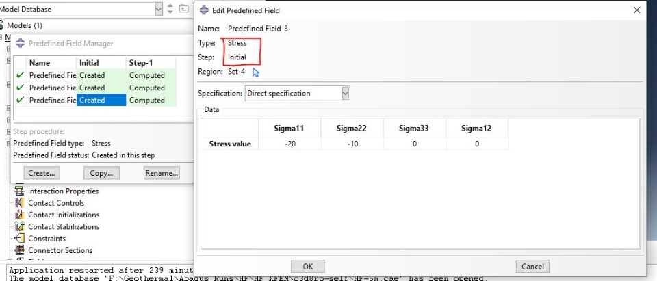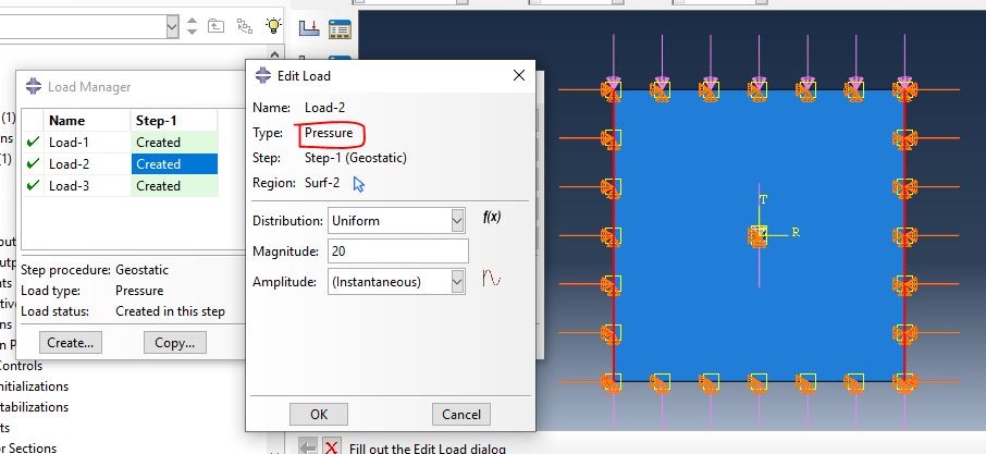 I have defined a basic 2D rectangular model with a hole in the center and I am trying to apply initial geostatic stress to this model and see if the results from Abaqus are same as the analytical solution of Kirsch equation. When I use "predefined field>initial>stress" to define geostatic stress (image 35, below), which is the method used in ABAQUS sample example file "hydrfract_xfem_c3d8rp" to define geostatic stress, the results are not same as the Kirsch equation but when I define the stresses as "load>pressure" (image 36), the results are same with the Kirsch equation. But my problem is that I have seen in some videos that I shouldn't use pressure load in geostatic step and also when I use pressure to define geostatic stress, I can not run the *cflow in soils step and it gives errors, while if I use predefined stress, I don't get any errors. How can I define geostatic stress properly that the stress around the hole can agree with the Kirsch equation? And there is another option in "predefined field>geostatic stress" that I read the user assistance but I don't know how to use it. Any help is appreciated
