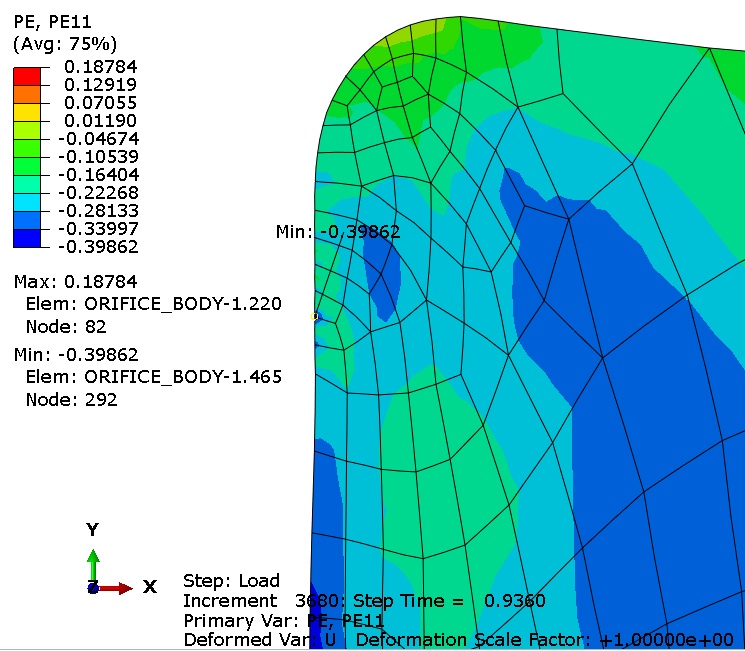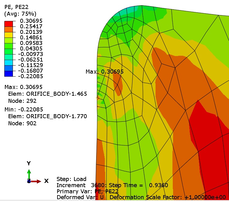 I am doing axisymmetric simulation, these elements are CAX8 (and in contact - frictionless, exponential P-O relationship), it's a pressing simulation with quite large overclosure. I used bilinear model of plasticity where the end point of the plastic line has 1 (100 % of plastic strain).