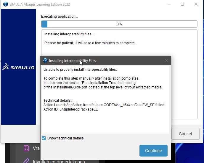 When I try to install the 2022 student version of Abaqus I end up with an Interoperability error during installation. Once the installer says it is executing applications and installing interoperability files, I end up with an error prompt: