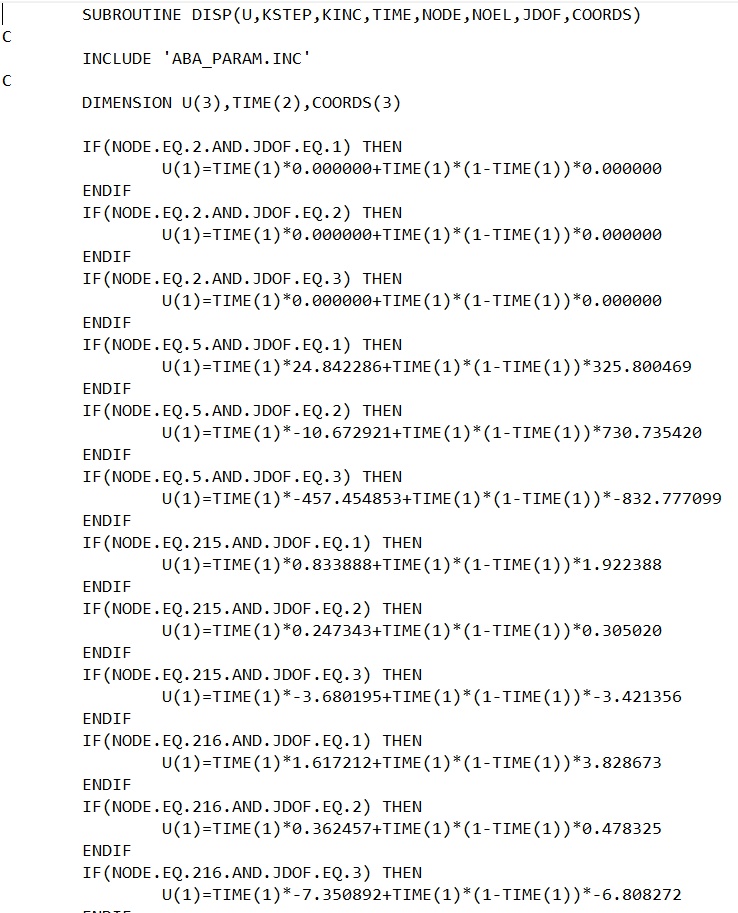 etc., where in this example I am updating the 3 translation degrees of freedom of node 2. I am writing these three lines for every node I identified in the previous step. Attached is an example of what this might look like for a series of nodes. Of course, I have an ENDIF/RETURN/END at the end of the code.