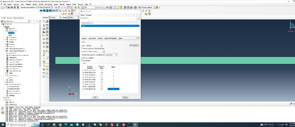 Can anyone help me how to update the modulus of elasticity over time using subroutine in Abaqus. In my case, I want to model the time-dependent elastic modulus for several time cases and get the displacement result for each time case. My model is a simply-supported 2D prestressed concrete beam with a single straight tendon. Let's say the time cases are from loading day (28 days) until 365 days after casting the concrete. And I want to get the upward displacement due to prestress load only for each time case or each updated elastic modulus. I tried to use USDFLD subroutine but because I'm newbie either to subroutine or Fortan, my job got aborted. I'm sure I did some mistakes in the codes.
