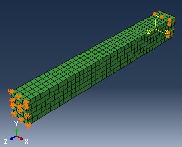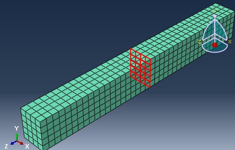 (on the left shows the layer of cohesive elements that are zero thickness) on the right it shows compressive and fixed boundary conditions.
