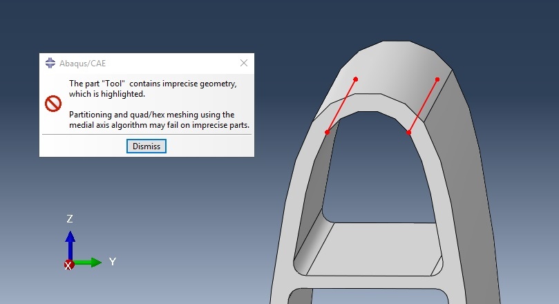 Some geometric operations in Abaqus/CAE such as partitioning often fail on such "imprecise" geometry, which makes desired meshing cumbersome or even impossible. A real trouble begins when an initial model is not fine in CAD system. For example, a precision of 0.01 mm or larger is needed to close all gaps between faces of a solid. In this case most likely Abaqus/CAE will consider such model as invalid, despite it is only imprecise and still workable.