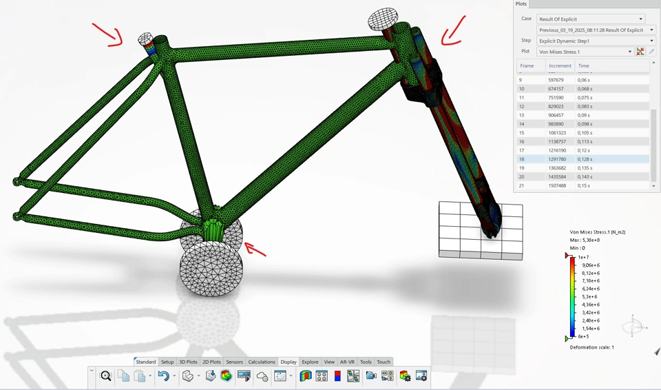 The frame’s movement behaves as expected, but the problem lies with the parts attached to the frame. These parts are meant to hold the weights, which this test accounts for, but they are not moving rigidly with the frame. They should rotate together with the frame and transfer the stresses from the weights and impact forces through the structure, but that is not happening.