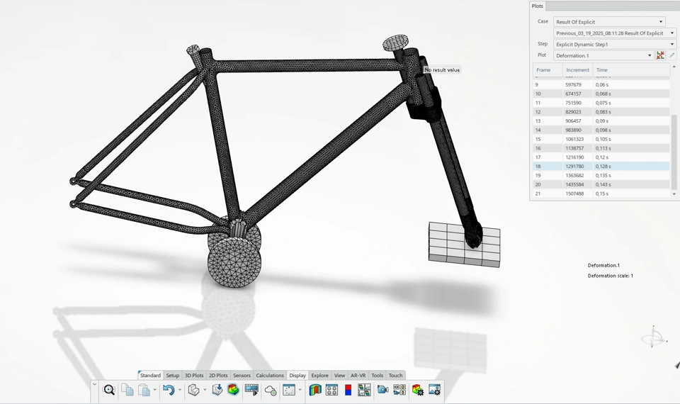 I'm having an issue with my school project related to a bike frame simulation. The frame is rotating around an axis (rear dropouts) while also falling due to gravity. The contact occurs between the roller and the ground. I've made the gap between the parts (upon the impact) really small to speed up the simulation applying initial rotational velocity on it.