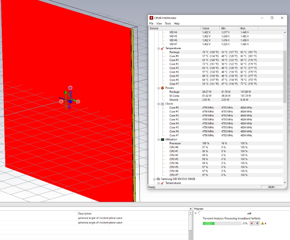 I can successfully simulate using the hardware acceleration option in CST Studio Suite using the T Solver. However, when it comes to processing the broadband farfields for an RCS simulation, it completely forgets about the GPU and puts all the heavy load on the CPU. Is there a way to enable GPU computing to also calculate the broadband farfields (using the T Solver, which supports the GPU through all the previous steps), or is it limited to use the CPU? It would be nice to have the option, it reduces my transient analysis to almost 1/4 of the time without it, although I am running it on an nvidia RTX 2080 Super using the environment variable to enable it, the same thing happens when using my university server which runs on supported GPU cards for HW acceleration (Tesla M60).
