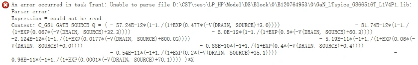 When I tried to import the Spice model of the Infineon GaN tube to the CST Studio Suite for simulation, the software failed to read some statements in the model and reported the following error: