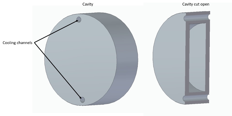 I am working on the design of RF cavities for particle accelerators. I would like to use CST to simulate the function of the cooling system (cooling channels) of one of my RF cavities. To describe my problem, I have designed a simple CST model that I want to show here as a picture (on the left as a whole, on the right as a section). In this case, the cavity is a simple pillbox cavity in which (in the large hollow space) an EM field is induced. Due to the EM field, a thermal load arises in the walls of the cavity. This thermal load is to be counteracted by cooling water which is led through the two cooling channels (simple long holes). I would now like to simulate what temperature the cavity reaches at a certain power of the EM field and a certain flow of cooling water.