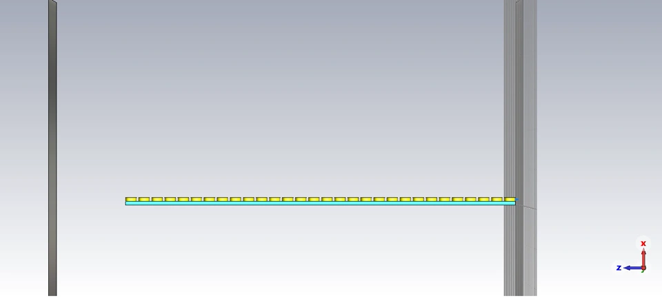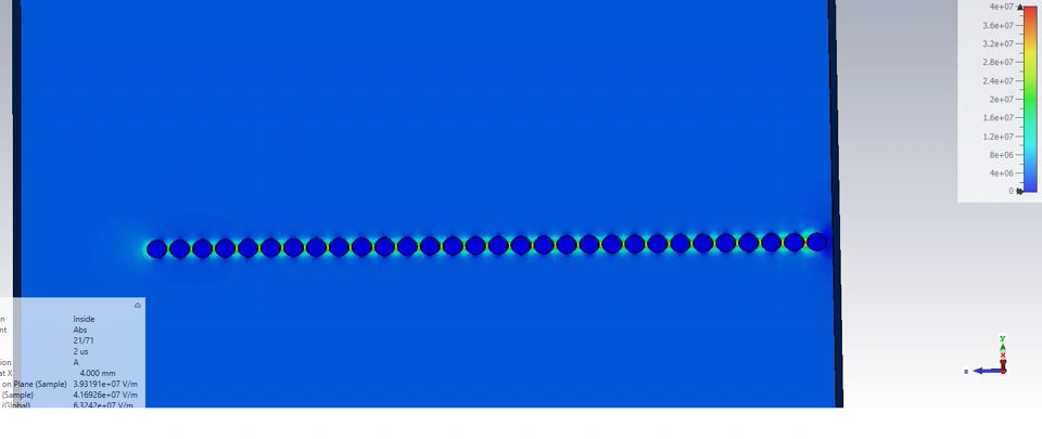 Hi...I have a setup as shown in the figure above (Setup.jpg). In this, I have two parallel plates of PEC material (the top plate is 1V, the bottom plate is grounded, i.e., 0V), and in between them is a dielectric slab (er=5.515,tand=0.0003) over which I have 30 cylindrical segments of Aluminum material having a constant separation between them. The last segment is connected to the ground plate (0V). The excitation is a double exponential signal of peak amplitude 1MV, Trise =0.4us, and Trise=70us (a standard waveform). I have the Et=0 boundary condition imposed on the top and ground plates and all others as Ht=0 to eliminate any fringe fields and have a uniform E-field directed from the top plate to the ground plate (verified the boundary conditions).