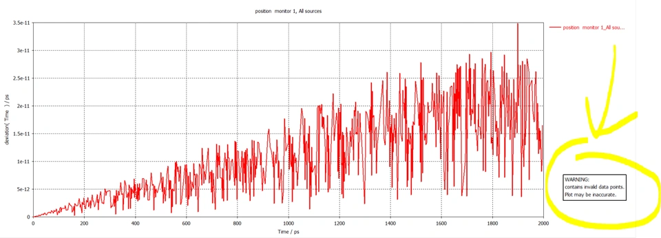 Hello everyone, I'm doing some simulation using PIC simulation to evaluate the time delay of an electron beam inside an electrostatic accelerator, using one packet of emitted electrons and using the position monitor to evaluate the time deviation inside of the bunch, along the flight time, but the resulting graph doesn't make a lot of sense and as you can see in the right bottom corner a strange error that I have never seen has now appeared.