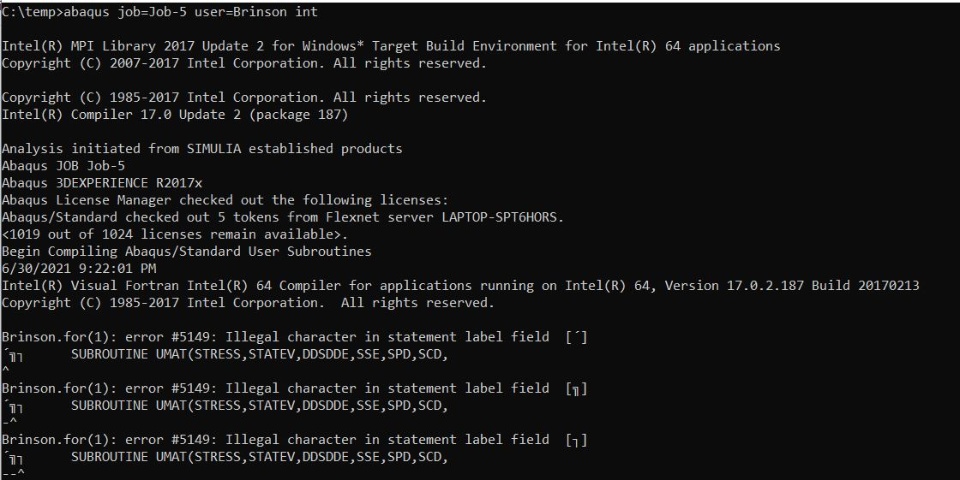 When I checking the UMAT subroutine that I have created, among other errors that Abaqus Command shows me, I get this one: