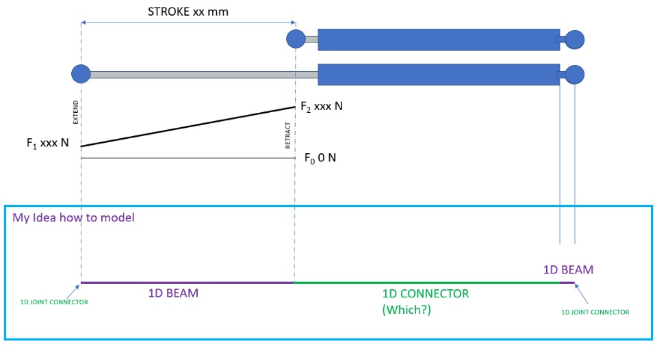 I have question how to model gas strut (attached on the picture, picture is downloaded from google it not shows my case, but it is for engine hood too). I have the working graph for gas strut and idea how to model it(sketch on the picture). I do not have much experience with connector. This is why I please you Users for advise. Which connector to use, how to set it. Thank you.