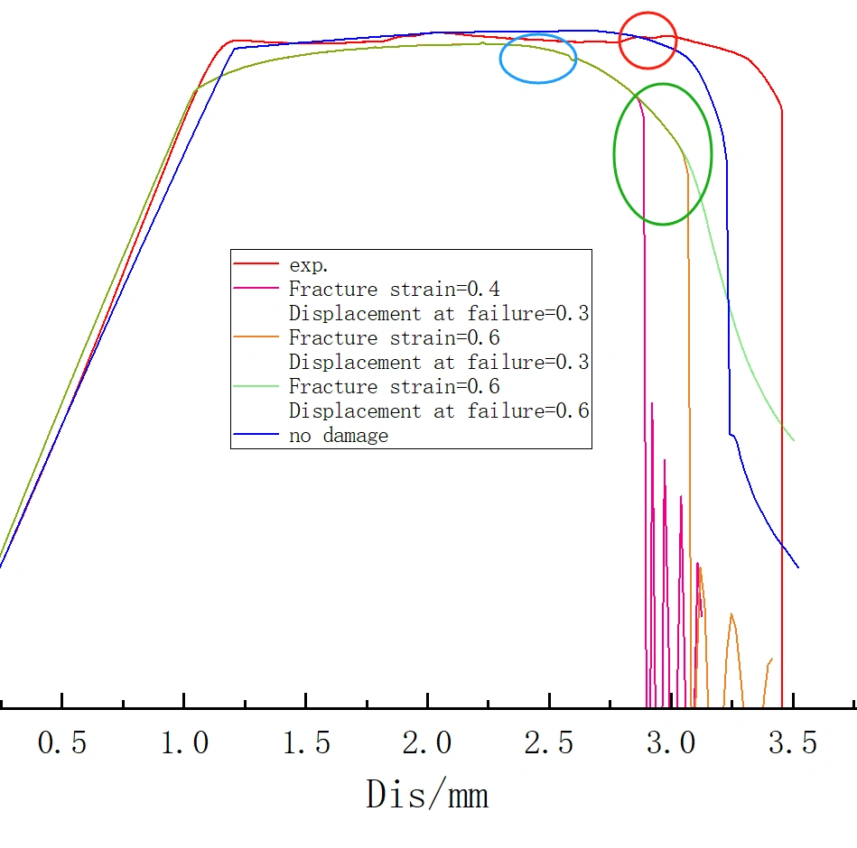 But when I add a damage model, such as a ductile damage model, the control parameter will only control the necking of the material when it is less than 2.8mm (blue circle or before), and the control of the "fracture strain" and "displacement at failure" will only have an effect at a later time (green circle)