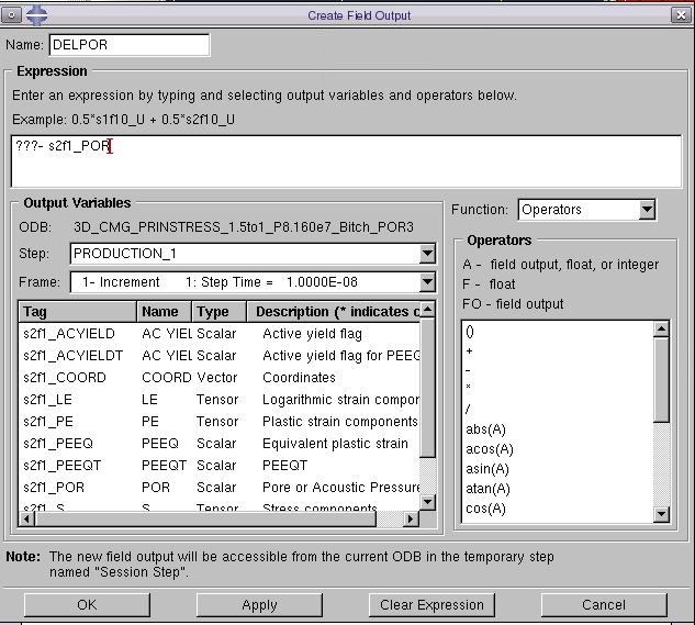 Hello All. I have a submitted a coupled diffusion stress analyses in Abaqus and currently looking at the ".odb file" showing field outputs. Does anyone know how to create a new "synchronized" output variable with Abaqus in the "Create Field Output" window (Tools->Field Output->Create From Fields)? I could not find a way to this in the examples provided in the 2017 Abaqus documentation. For example in my current .odb file, I have an output for pore pressure (POR) for 165 frames within a step. From this POR field output, I would like to calculate and output the difference between the pore pressure at any given frame of time with respect to the pore pressure of the initial time frame within the step (which i label DELPOR).