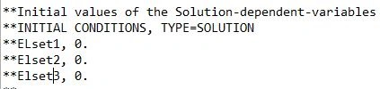 within the input file for a specific material. And then tried to define the initial values for these SDVs by associating them with each of the element-sets: Elset1, Elset2 & Elset3