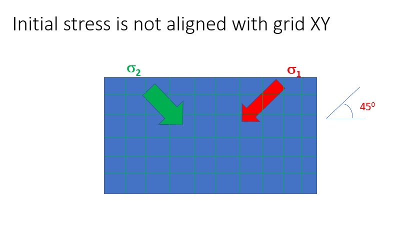 I am wondering if there is an easy way to input initial stress for each element when known initial principal stress orientation is not aligned with mesh XY. For example in the below figure, I know initial principal stress of S1 and S2, but their orientation is 45 degree with respective to mesh X direction. But in Abaqus, I have to input initial stress for each element ( S11, S22, S33, S12, S13, S23) in define XYZ direction. In my 3D problem, in Z direction, every mesh has different S1 and S2. How do I input these initial stress for each element? Thanks