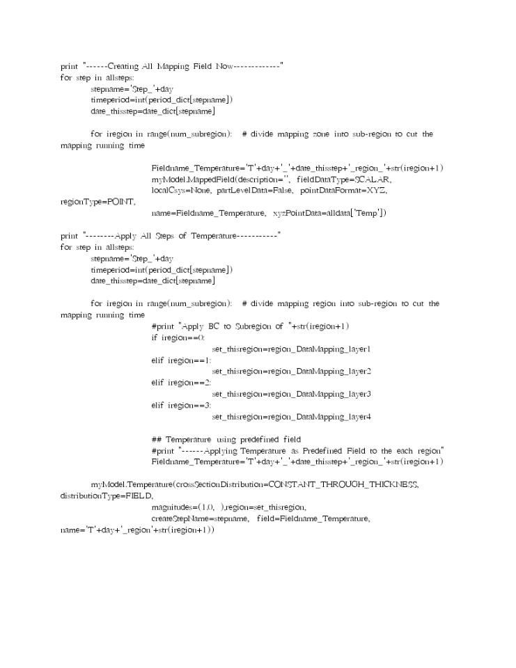 I need your help again. I have been struggling for a long time to do field mapping from external temperature field ( cloud point with format of XYZ T) to Abaqus. If I do it in CAE, the CAE will freeze for a long time. So I made a Python script. The remaining issue is mapping time is really long for my big 3D model with 30k nodes, for example, 20 minutes for one step mapping. I have 100+ steps, so it will take me almost 2 days to do mapping before creating an inp file. To reduce the mapping time, I have already divided the mapping zone into 4-8 layers. I am posting my script here to see if there is something you might notice to reduce mapping time. The logic is: loop over each step to create mapping field, then loop over each step again to apply mapped field to the region as predefined BC field. If this question is inappropriate, please let me know so I can delete it. Or if there is another method I could use, I would love to try that. I would appreciate it for your time. Thank you!
