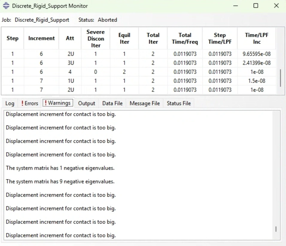However, after I have made these changes, I receiving warnings that said "displacement increment for contact is too big" and convergence issues arose. The model was immediately aborted due to "time increment required is less than the minimum specified" which is of size 1e-8.