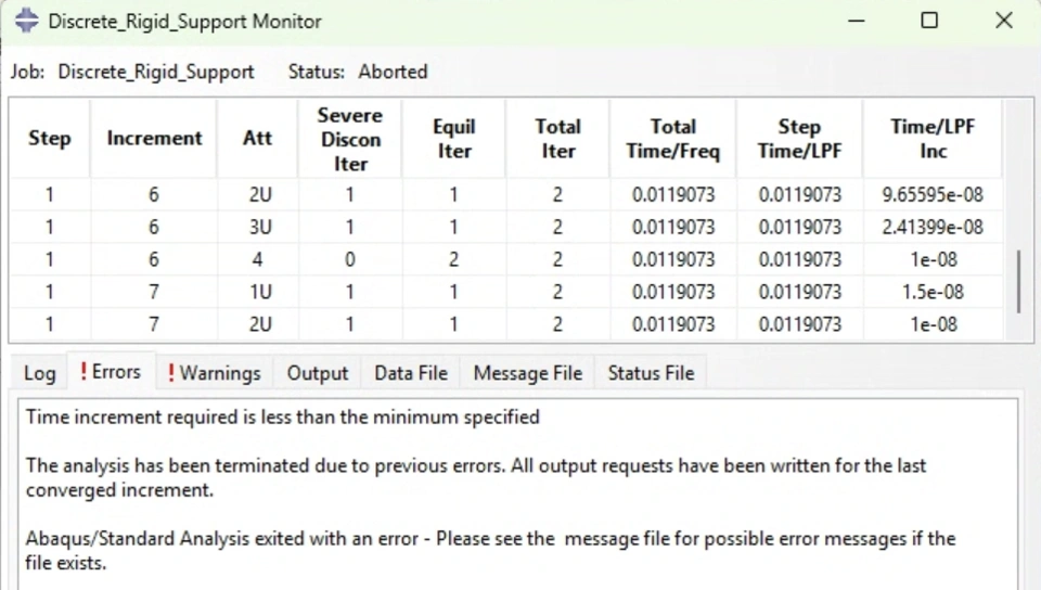 After these modificaiton I then submitted the job and received the aforementioned warnings. The modell was aborted due to "time increment required is less than the minimum specified".