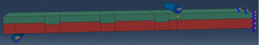 I later thought applying B.C. directly on the partition lines of the beam might affect results due to stress concentration, so I tried to create "discrete rigid" parts to simulate the support and loading. I followed tutorial I found on YouTube to create the "discrete rigid" parts and then create general contact interaction that excludes the interface of the composite to define contact property between the beam and the supports and the loading tool. "Hard contact" and a frictional coefficient of 0.2 were defined for the general contact. With other B.C. remained the same, I defined "encastre" at the face of the support cylinder to fix it and the same vertical displacement loading while keeping all other DOF fixed for the loading cylinder.