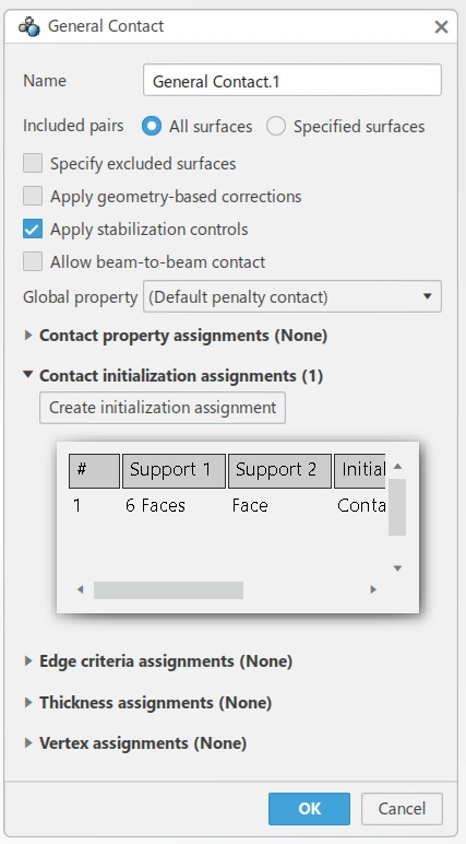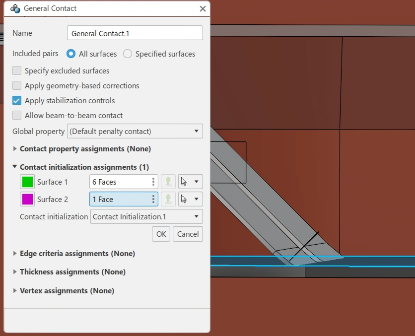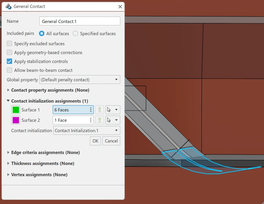 What I want to achieve is simple in theory: the bottom surface of the spring should be in contact with the top surface of the black part. As shown in the attached images, I have selected these surfaces accordingly. However, I suspect that due to the general contact formulation, additional unintended surfaces are interfering. I have tried excluding those from the general contact definition, but I’m still running into issues like zero-volume elements and pivot warnings.