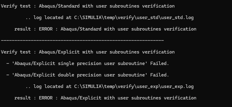 I checked whether abaqus is properly linked with intel fortran, and it was properly linked. However, when i tried running verification, both standard and explicit using subroutines displayed error. Can someone help me solve this.
