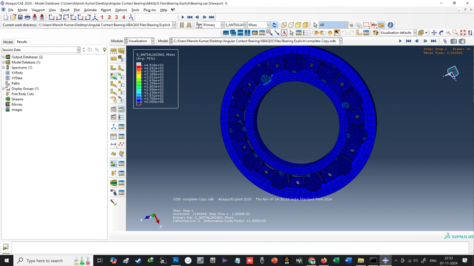 In continuation to my post, I would elaborate the problem: I am using an explicit solver to simulate the ball bearing. I have given rotational velocity of 1000 rad/s to the cage and balls for a step time of 0.01s. The balls and inner cage rotates for 0.004s only and then the rotation stops, whereas rotation should continue for the entire duration of 0.01s. After 0.004 s only stresses are being developed in the balls. If you could point the mistake from your experience that why is it so that rotation is not continuing for the entire step duration?