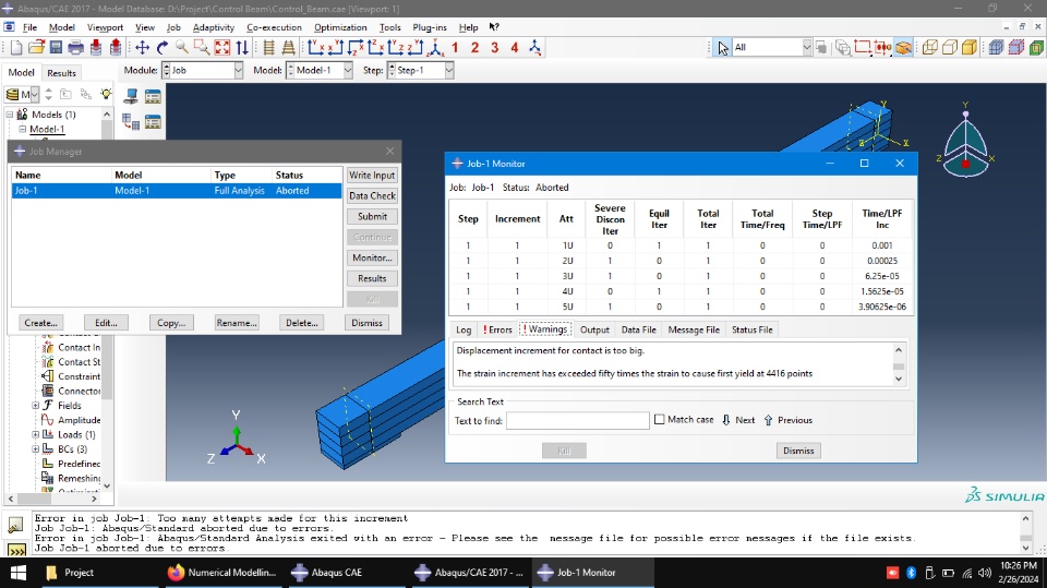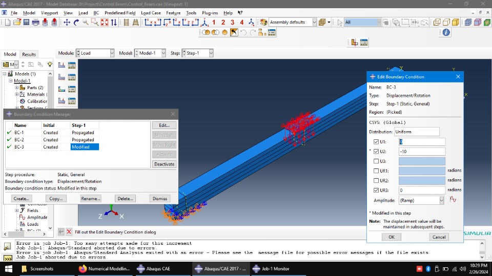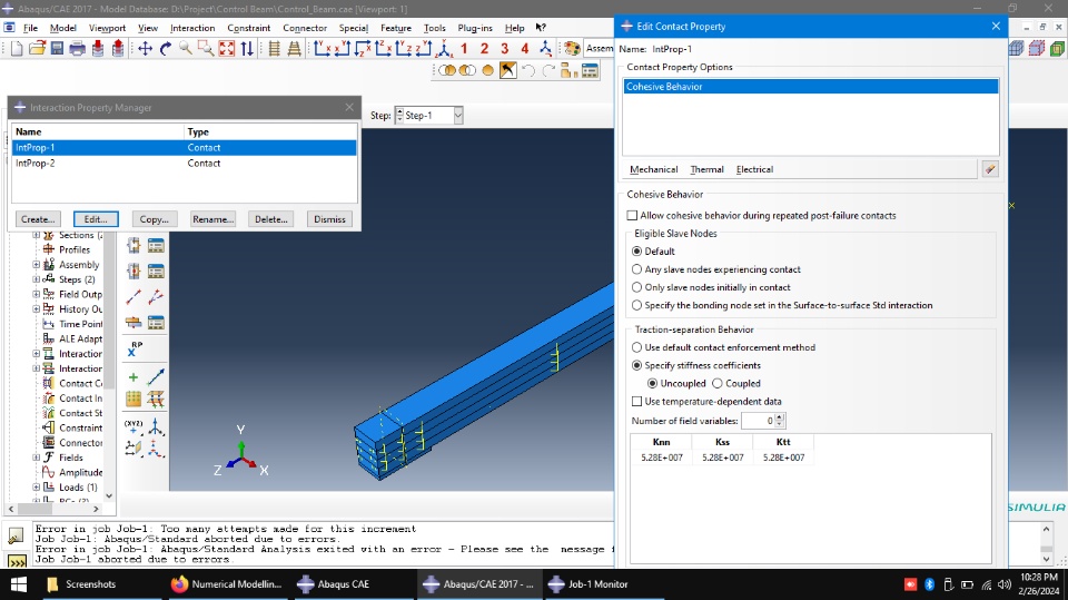 I am working on 3-point bending test on glue laminated timber beam but I keep getting the folloing errors shown in the image below while simulating the beam in abaqus. I have also attached the interaction property details, time increment details and also the load details. If anyone could please help me out that would be quite helpful. Thanking you in advance for your suggestionsAbaqus CAE