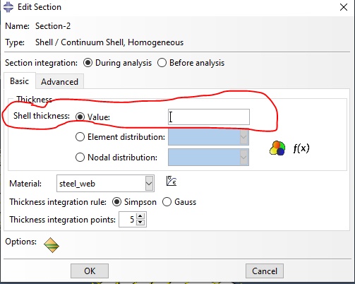 Due to complex and large geometry and to avoid a lot of partitioning for generating the mesh, If I make a solid part into the shell part by using solid to shell converter in Abaqus. Then in the material property assign section: what should I put in the thickness of the shell which is already provided during the 3d part drawing?