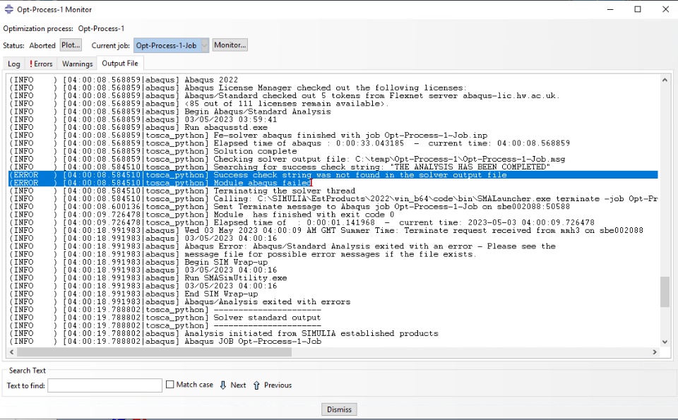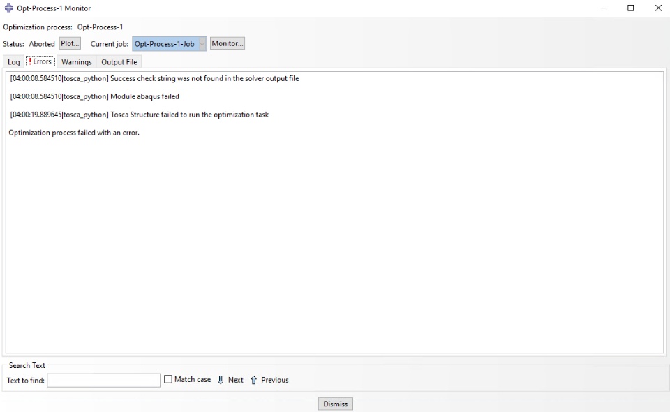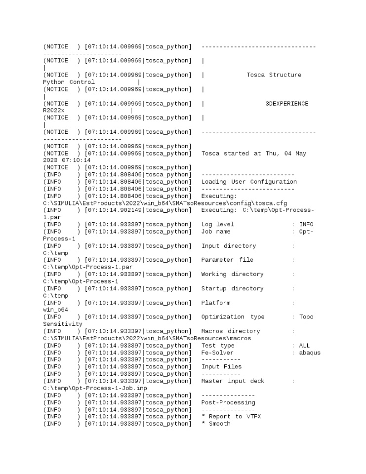 [07:14:36.633817|tosca_python] Success check string was not found in the solver output file [07:14:36.633817|tosca_python] Module abaqus failed [07:14:48.024435|tosca_python] Tosca Structure failed to run the optimization task Optimization process failed with an error.
