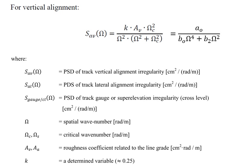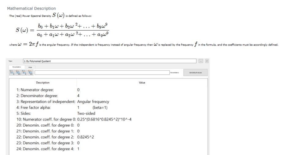 First, I must create a Power Spectral Density function (PSD - stochastic 108) from a formula given in the first attached image. This image is for an FRA vertical track irregularity. As seen in the image, a polinomial quocient can describe this formula and SIMPACK provides this feature (second attached image).