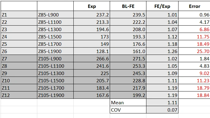 I’ve been working on the FE validation for the flexural buckling of press-braked stainless steel Z-section columns, but I’m noticing that the error increases as the column length gets longer (attached a table for reference).