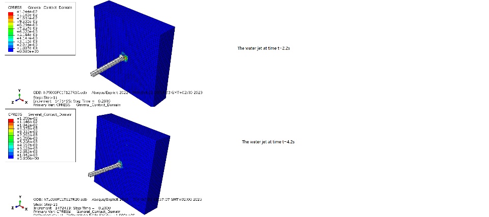I have recently conducted simulations in Abaqus 2022 Explicit regarding convective heat transfer between a liquid and a metal plate. The method I selected for this simulation in the step is Dynamic, Temperature-Displacement, Explicit. Heat transfer occurs on one surface of the plate, which is penetrated by a liquid jet. Heat transfer should take place in the contact area between the liquid and the solid. To achieve this, I implemented a Python function that detects the contact area between the liquid and the solid using the C_PRESS data on the nodes of the contact surface of the metal plate. The resulting area was taken as an analytical field (a mapped field with a field value of 1 at each node), which is used in the film condition to implement the heat transfer coefficient for the new restart job.