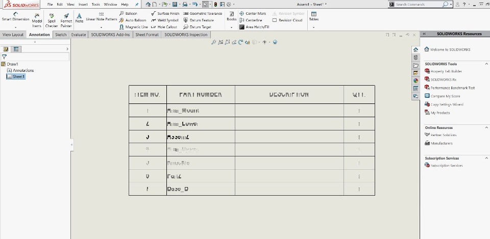 BOM table isn't showing properly, I restarted SW tried on new models, changed fonts, size, table size everything still can't figure it out. Help Please. Thank you