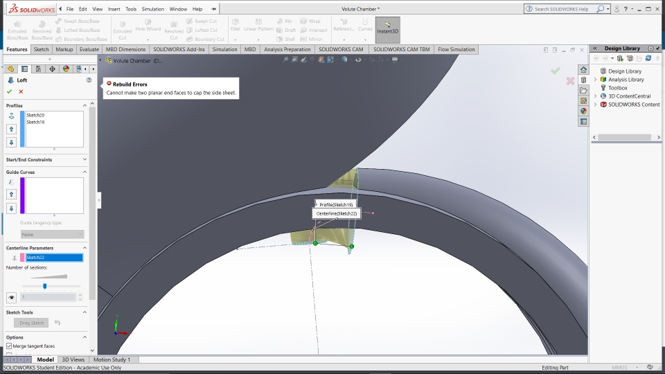 I am having trouble lofting where I keep receiving the error "cannot make two planar end faces to cap the side sheet." This happens only when I add the centerline parameter. I was hoping you guys could help me resolve this issue. Looking forward to hearing from you.