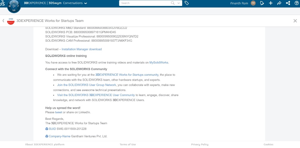 We've applied for the startup programe and we've received the trial version of the software, which is over 3 days back. I haven't received anything from solid works team on VAR assignment as mentioned on the mail.