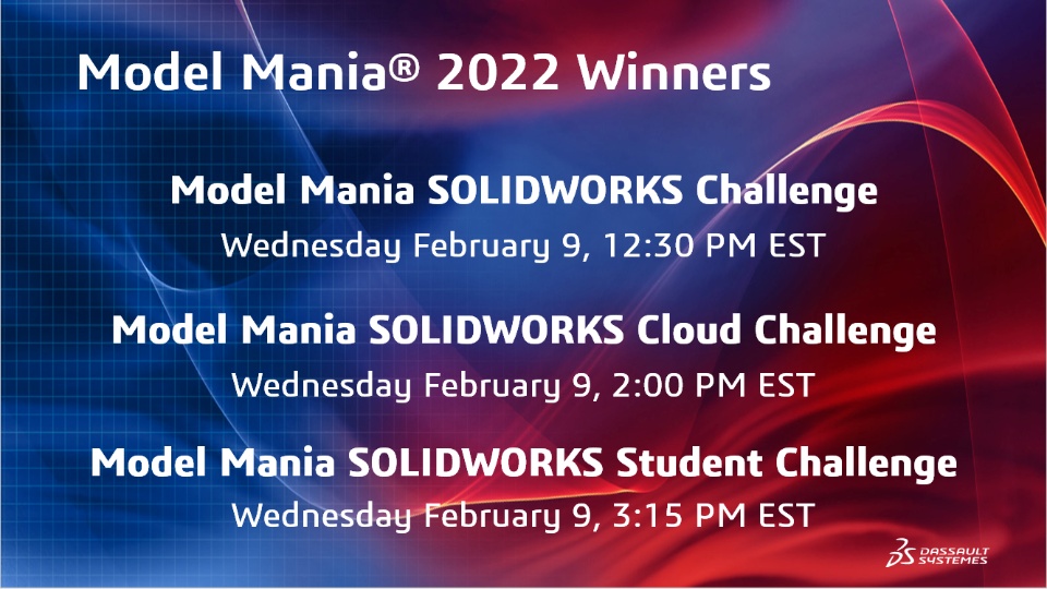 1. Model Mania SOLIDWORKS Challenge: 12:30 PM EST