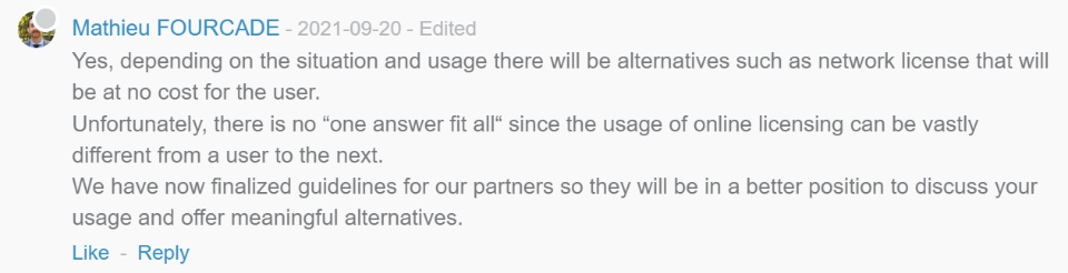 @MF So now the one year anniversary of the discontinuation of online licensing has passed. I could very well use an easy way to have SolidWorks available on multiple locations, so let me remind you Mathieu of all the alternatives you promised the users. How can we receive the Network License at no additional costs? Our VAR's haven't been informed, never saw any guidelines, so they probably are not on the list of your partners.