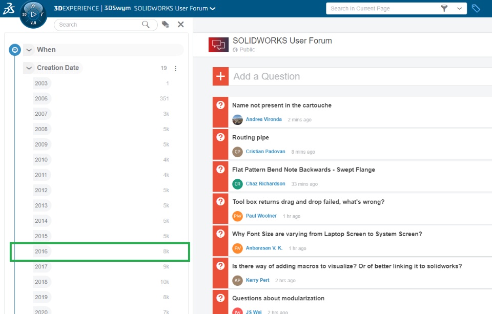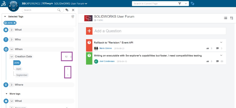 @TS not sure if this is the right / best place but it worked for the Missing Replies thread; when I try to use tags to filter whole swathes of threads disappear from the list. e.g. if I'm in the SolidWorks user forum, turn on tag filtering and look at When > Creation Date, over 8000 threads are indicated for the year 2016;