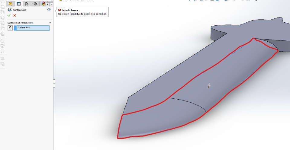 I created a lofted surface as a means of creating a variable-width chamfer, and I'm attempting to create a surface cut to perform the cut. However, this results in a generic "Operation failed due to geometric condition" error. Any help is appreciated. Thanks!