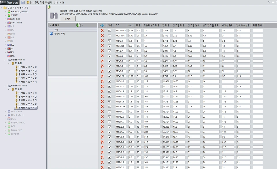 So, I checked hole wizard setting and the Helicoil Tap tables of all(Insert=1.0.~ Insert=3.0) are same data.