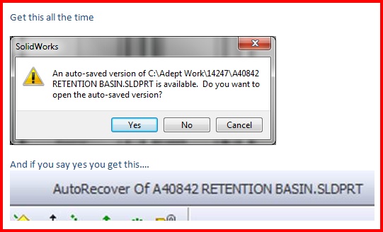 We recently upgraded our workstations from SolidWorks 2011 SP5 to SolidWorks 2012 SP3. Several of our engineers are constantly getting the following prompt: “An auto-saved version of is available. Do you want to open the auto-saved version?” (I have attached a screenshot.) This message appears at random times on several workstations even when SolidWorks has not crashed. Because this is a message that they have rarely seen, a few of the engineers are prone to hitting “yes” and wind up making major changes to older versions of files rather than making changes to the current version.