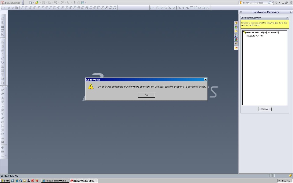 So my SW crashes because of not enough memory all the time, but thats not the problem. As shown in the picture below when i reopen and try to use the auto save it gives me an error wondering if anyone else has seen this. Possible solutions?