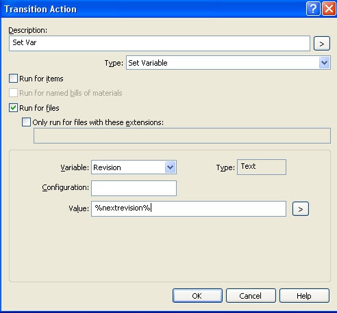 I am trying to configure a workflow to automaticlly set therevision of part, drawing, and assembly files when moved throughacertain transition. I am failing though. I find the admin guidesnot detailled enough and would like some help. Has anyone donethis? I also would like the revisions to appear on the drawingstitle block and in the data card. I believe my only mistakes so farare setting the revision control in the workflow.