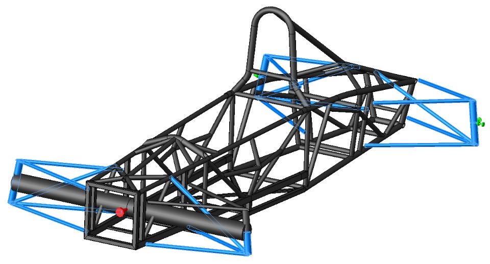1) There is no option for applying a remote load, rigid link, oranything similar when using beam elements. My original work-aroundwas to define a new "Rigid" material with a really high modulus,however there is a limit on how high you can make the modulus (andit's not as high as I would like it to be)! My second work-aroundwas to model the suspension as solid members of appropriatediameters and model the torsion beam (the component applying thetorsional moment to the chassis) as a 4" diameter beam to minimizeits influence (deflection) on the model.