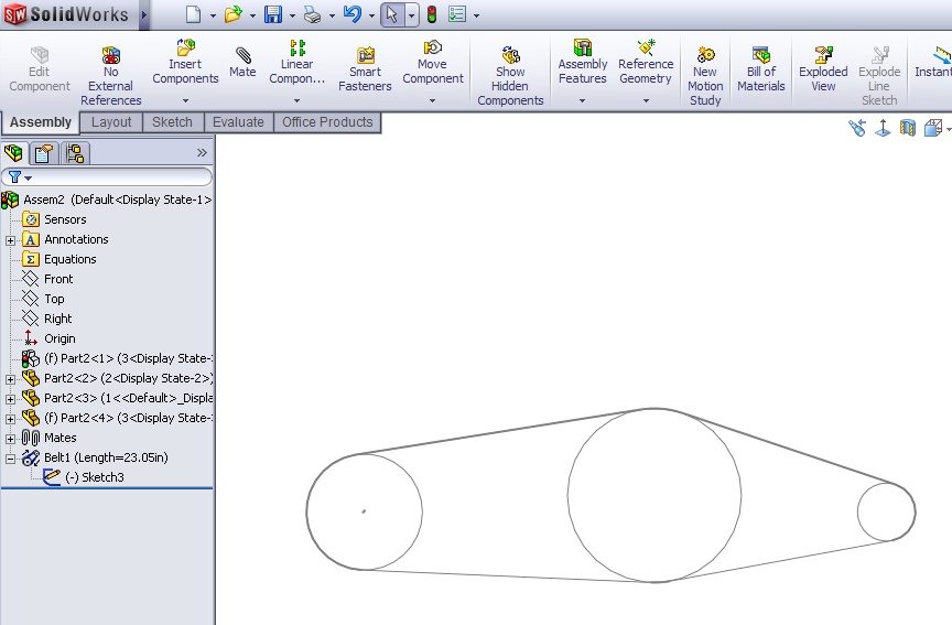 I am using SolidWorks 2009 to model a system that has three pulleys. Their faces are coplanar, and their bores are colinear. The middle pulley has a larger outer diameter than the other two. When I try to add a belt to this assembly with the Belt/Chain tool, I can only get the belt to wrap around one side of the middle pulley; the other side of the belt takes a straight-line path between the outside pulleys, which causes the belt to pass through the profile of the middle pulley. I've tried reordering the belt members, I've tried selecting different combinations of edges and faces, I've tried flipping the belt, and I just can't get it to wrap the way it would realistically. This seems like a pretty simple application of the tool, so I must be doing something wrong. Can anyone provide some suggestions? Thank you in advance.